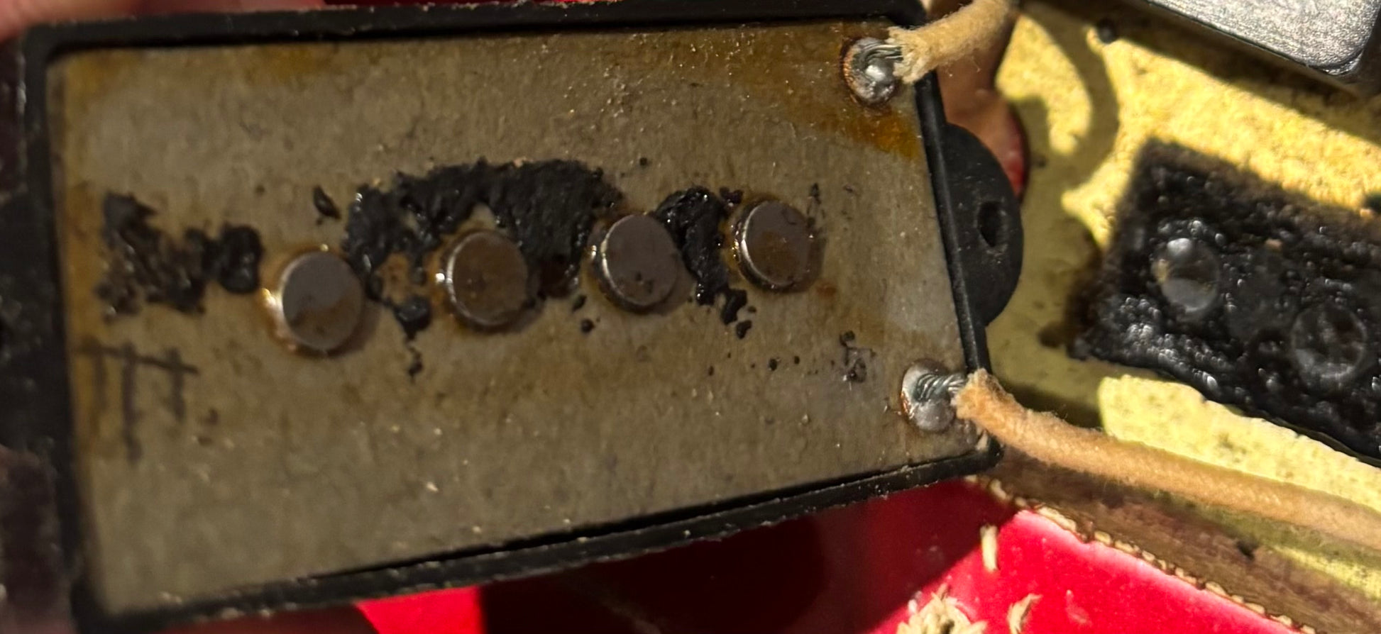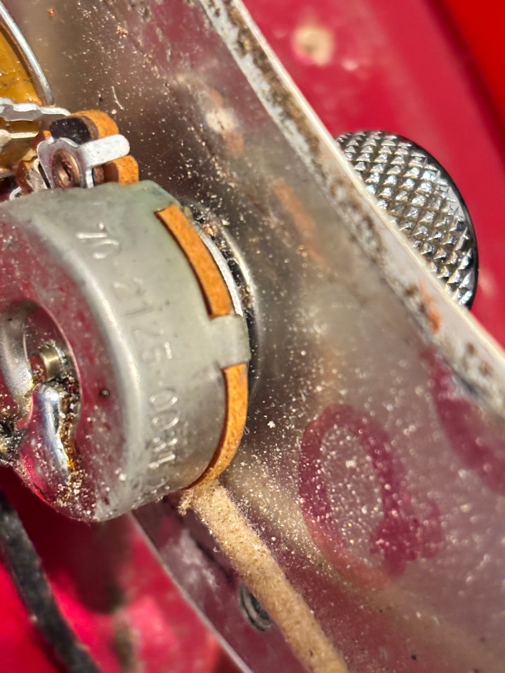 Original Factory Candy Apple red finish shows wear, exposing the gold undercoat.